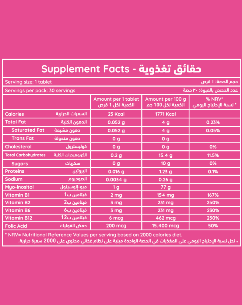 • التوازن الهرموني: يساهم الميو-إينوسيتول وفيتامين ب6 في تنظيم النشاط الهرموني ودعم الصحة الإنجابية الطبيعية.