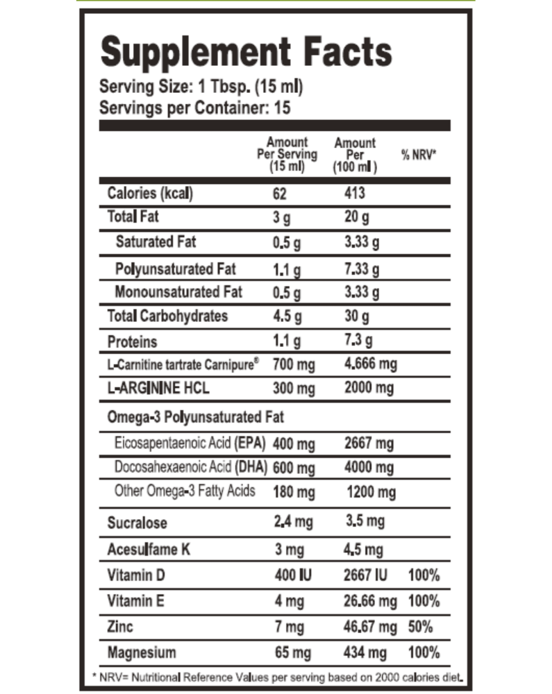 أحماض الأوميجا 3: 1180 ملجم، فيتامين د 400 وحدة دوليه، زنك 7 ملجم، ماغنيسيوم 65 ملجم، إل أرجينين 300 ملجم، إل كارنتين 700 ملجم