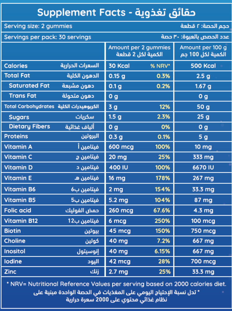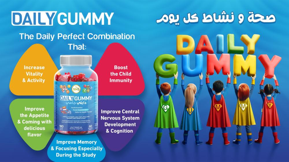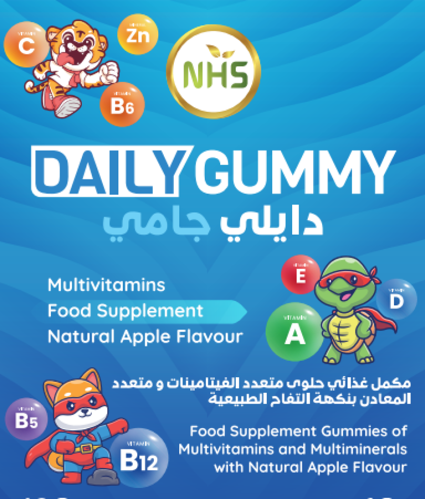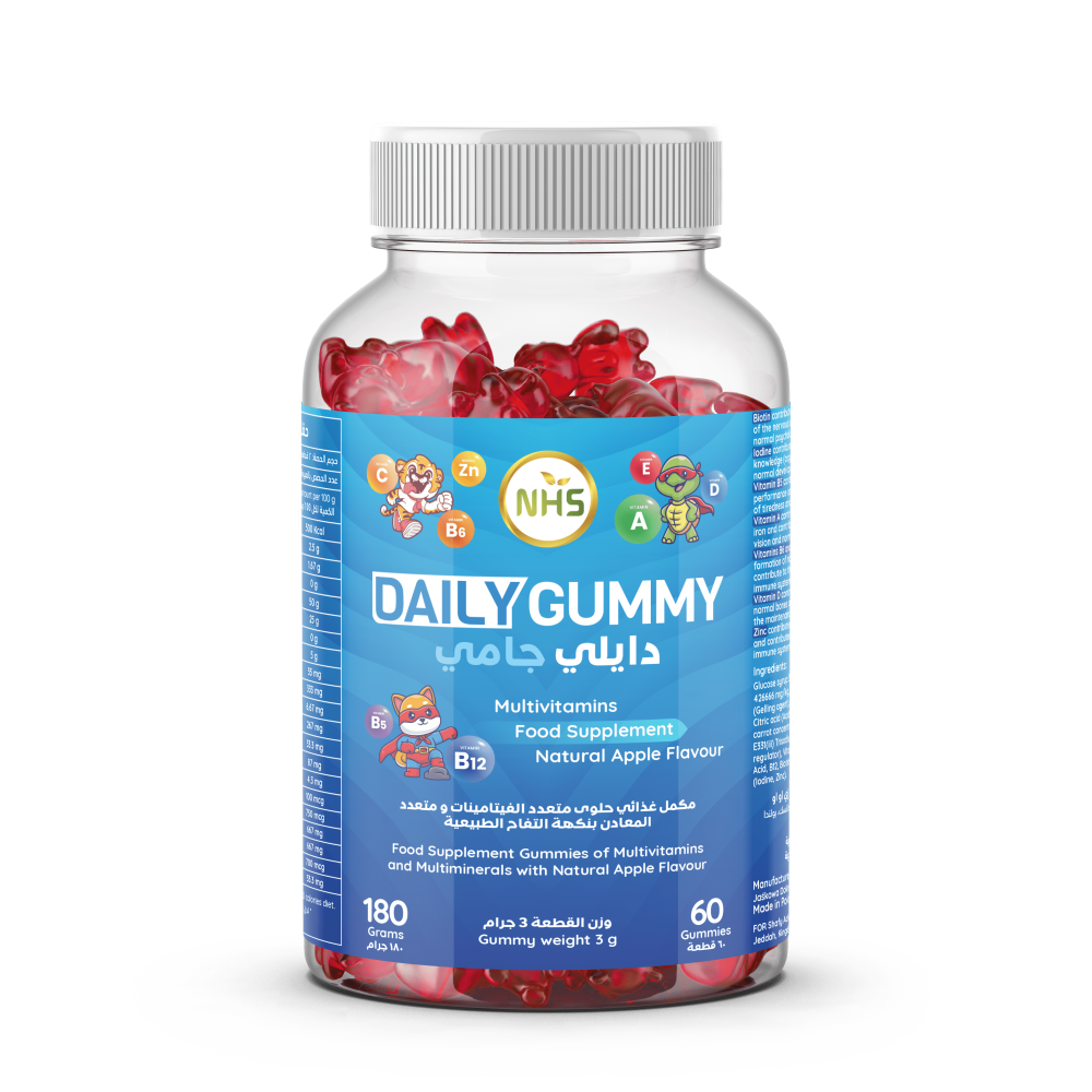 - NHS Daily Gummy دايلي جامي Multivitamins is packed with essential vitamins and minerals like Vitamin A, C, D, E, B vitamins, zinc, iodine, and more, in child-friendly amounts.